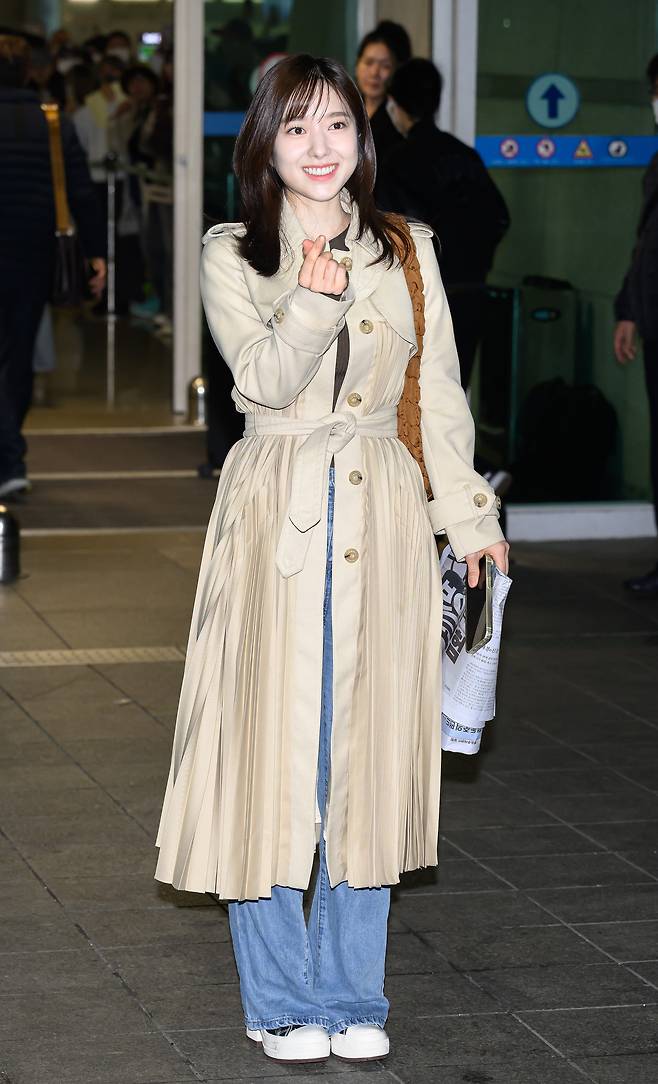 오지원 기자 : 군더더기 없는 룩. 목선과 다리를 훤히 드러낸 의상에 와이드 핏 재킷을 더해 여성스러운 매력을 한층 강조했다. 여기에 긴 생머리, 컬러가 단출한 메이크업이 청순함을 두 배로 만든 것으로 보인다.