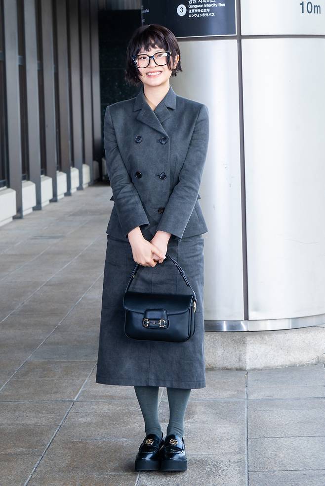 곽현수 기자 : 그레이 컬러 상하의에 블랙 컬러 구두가 합쳐져 지나치게 단정한 착장이 완성됐지만 뉴진스 하니의 헤어 스타일과 얼굴의 반을 가리는 안경 아이템이 이 착장을 사랑스럽게 변화시켰다.