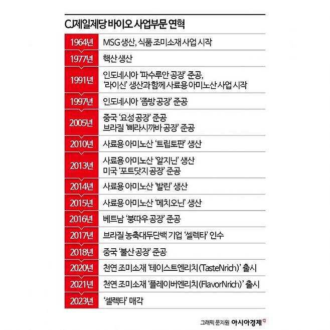 이 회사의 바이오사업은 1964년 조미료 '미풍'을 출시하면서 시작됐다. 당시 대상그룹의 전신인 미원그룹이 선보인 '미원'이 음식의 감칠맛을 높이는 조미료로 선풍적인 인기를 끌자 MSG(글루탐산나트륨)를 활용한 미풍을 내놓았다. CJ제일제당은 이후 1977년 핵산을 생산하며 식품 조미 소재 사업을 키웠고, 1991년 인도네시아에서 라이신 생산을 시작하며 사료용 아미노산 분야에도 뛰어들었다.