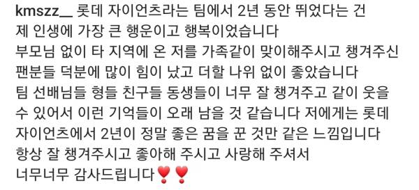 김민석은 "팀 선배, 형, 친구, 동생들이 너무 잘 챙겨주고 같이 웃을 수 있어서 이런 기억들이 오래 남을 것 같다. 나에게는 롯데에서 2년이 정말 좋은 꿈을 꾼 것만 같은 느낌이다"라며 "항상 잘 챙겨주고 좋아해주고 사랑해주셔서 너무너무 감사드린다"라고 동료들에게도 고마움을 전했다.