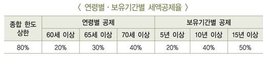 세대가 아닌 인별로 합산 과세하는 종부세는 시세가 아닌 공시가격을 기준으로 부과합니다. 종부세는 원칙적으로 9억 원을 초과하는 공시가격에 대해 과세하지만 1세대1주택인 경우 12억 원(기본공제)까지 과세를 하지 않습니다. 또 산출 세액에서 연령과 보유기간에 따라 최대 80%까지 공제를 받을 수 있습니다. 아래 그림은 연령별·보유기간별 세액공제율입니다.