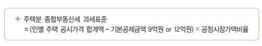 종부세 과세 표준은 납세자별로 주택의 공시 가격을 합산한 금액에서 9억 원의 기본 공제 금액(1세대 1주택은 12억 원)을 뺀 금액에서 공정시장가액비율(60%)을 곱한 금액으로 산출합니다. 공정시장가액비율은 60~100% 범위 내에서 정하는데요, 문재인 정부 시절인 2019년부터 매년 5%포인트씩 상향 조정하다 2022년부터 60%를 일괄 적용하고 있습니다.