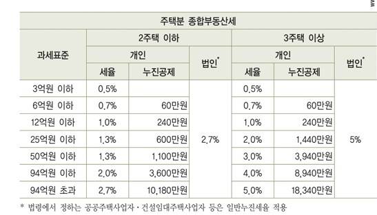 이에 비해 ③2주택 기본 과세는 기본공제 금액이 9억 원에 그치는데다 보유 기간과 연령에 따른 세액 공제를 받지 못합니다. 중과세는 3주택 이상을 보유한 사람에게만 과세되는데요, 지난해부터 2주택자 조정지역 중과세는 사라졌습니다. 지난 6월1일에 주택 세 채를 소유했다면 이후에 한 채를 처분했더라도 중과세율이 적용됩니다. 중과세율은 과세표준 12억 원 초과 구간부터 일반 세율보다 두 배 높습니다. 과세표준이 12억 원 이하라면 2주택 이하와 3주택 이상 모두 세율이 0.5%~1.0%으로 동일하지만 과세표준이 12억 원을 초과하면 2주택 이하는 1.3~2.7%, 3주택 이상은 2~5%의 세율이 적용됩니다.
