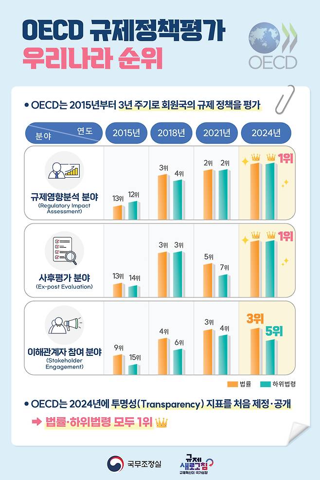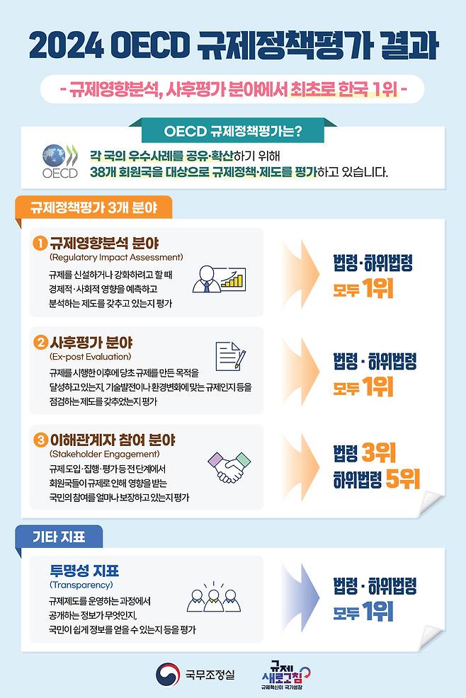 [국무조정실이 '2024년 OECD 규제정책평가' 결과 우리나라가 3개 분야 중 2개 분야서 1위를 달성했다고 밝혔다. (자료: 국무조정실)]