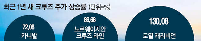 지난 22일(현지시각) 뉴욕증시에서 크루즈 3대장인 노르웨이안크루즈홀딩스, 로열캐리비안크루즈, 카니발의 최근 1년간 주가는 각각 86.66%, 130.08%, 72.08% 뛰어 올랐다. 이 세 회사가 전 세계 크루즈 시장에서 차지하는 점유율은 80%에 육박한다.