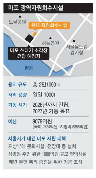 이에 따라 서울시는 하루에 1000t을 소각할 수 있는 신규 자원회수시설 건립이 시급하다는 입장이다. 서울시가 마포 쓰레기 소각장 건립을 추진하는 이유다. 서울시는 마포구 주민의 반발을 고려해 청소차 전용도로와 폐기물 저장소 등 각종 시설을 지하화하고 세계 최고 수준의 오염 방지 설비와 검증된 자동화 시스템을 도입해 관리한다는 방침이다. 또 지상부는 주변 공원과 수변 공간에 어울리는 랜드마크를 조성하고 상암동 주민을 위한 1000억원 규모의 편익시설도 제공한다는 계획이다. 세계 최대 규모 서울형 대관람차 '서울링'을 마포구 상암동 소재 하늘공원에 조성하겠다는 계획도 당근책의 일환이다.