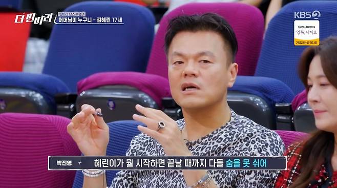박진영은 "진짜 혜리는 계속 말했지만 괴물 같다. 너무 위협적이어서 무대 끝날 때까지 숨을 못 쉰다"며 "다만 앞으로는 사람들에게 숨 쉴 틈을 줘야 할 것 같다. 보는 게 약간 힘들다. 설렁설렁 넘어가는 부분이 있어야 보는 사람이 숨을 쉴 수 있다"고 조언했다.