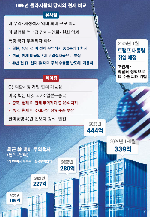 1985년 당시 미국의 대일본의 무역적자는 미국 전체 무역적자의 3분의 1에 달하는 498억달러였다. 한국은 지난해 역대 최대 규모인 444억달러의 대미 무역흑자를 기록했다. 한국의 대미 무역 흑자규모는 중국·멕시코·베트남·일본 등에 이어 8위다. 올해는 일본보다 한국의 흑자규모가 더 커질 것이라는 관측도 있다.