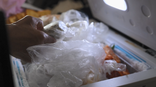 "이거 만두. (언제 받으신 거예요?) 이것도 지금... 두어달 될 거여. 이건 김치. 이건 부침개네."