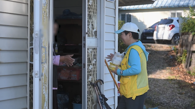"오늘 스물 두 집 가는데 세 시간 반 걸려요. 이제 첫 집 왔네요. 이 어르신은 많이 소화를 못 시키고 씹으시는 것도 불편하세요."