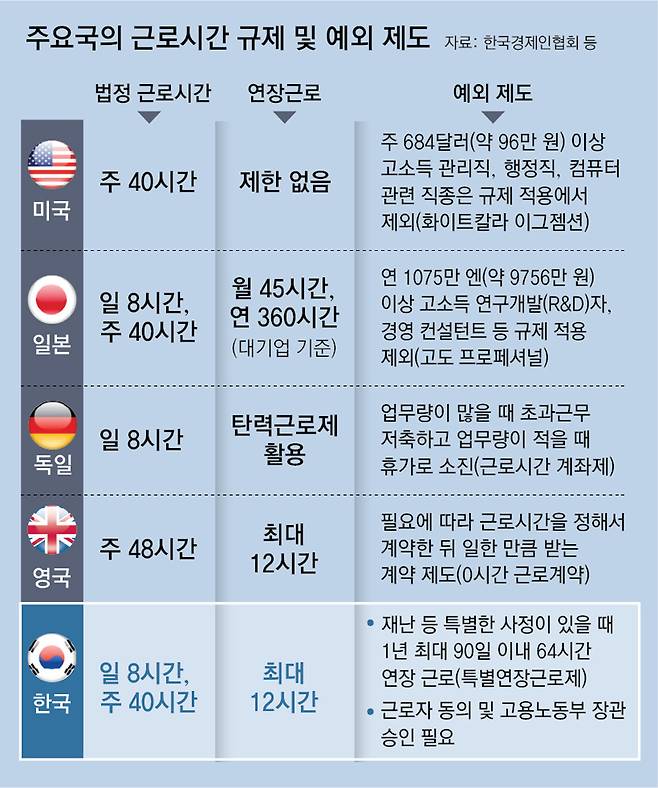한국처럼 장시간 근로가 사회적 문제인 일본도 2019년 초과근무를 법으로 제한하면서도 R&D 등에서 연 소득 1075만 엔(약 9756만 원) 이상 근로자를 규제 제외 대상으로 봤다. 대만도 노사 합의로 일정 시간의 초과근무와 수당을 법으로 보장한다. TSMC 연구개발팀은 하루 24시간 3교대를 통해 릴레이식으로 연구가 이어지도록 하는 것으로 알려졌다.