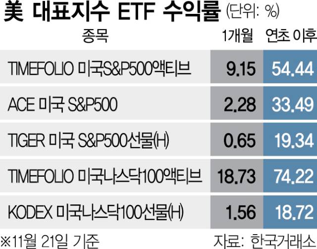 25일 한국거래소에 따르면 지난 21일 기준 최근 한달새 ‘TIMEFOLIO 미국나스닥100액티브’는 18.73%를 상승했다. 같은 기간 ‘KODEX 미국나스닥100TR’(3.38%), ‘TIGER 미국나스닥 100’(3.21%) 수익률이 3%대인 점을 감안하면 6배 이상 높다. 환헷지 상품인 ‘KODEX미국나스닥100선물(H)’(1.56%)과는 무려 12배 이상 격차가 벌어진다. 연초 이후로 기간을 넓혀도 수익률이 가장 높은 상품(74.22%)과 가장 낮은 상품(18.72%)의 차이는 4배 가량 벌어진다. S&P500 ETF들도 상황은 비슷하다. ‘TIMEFOLIO 미국S&P500액티브’의 한달 수익률은 9.15%로 0.6~2%대를 기록한 여타 S&P500 ETF 대비 높다.