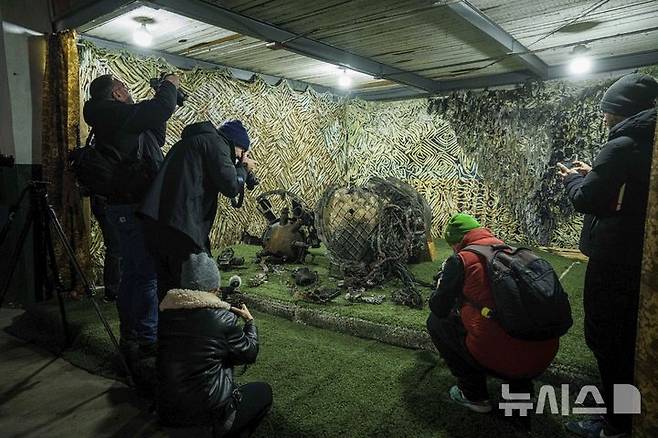 [우크라이나=AP/뉴시스] 24일(현지시각) 우크라이나의 비공개 장소에 있는 분석 센터에서 기자들이 지난 21일 드니프로를 강타한 러시아 로켓 파편을 취재하고 있다. 2024.11.25.