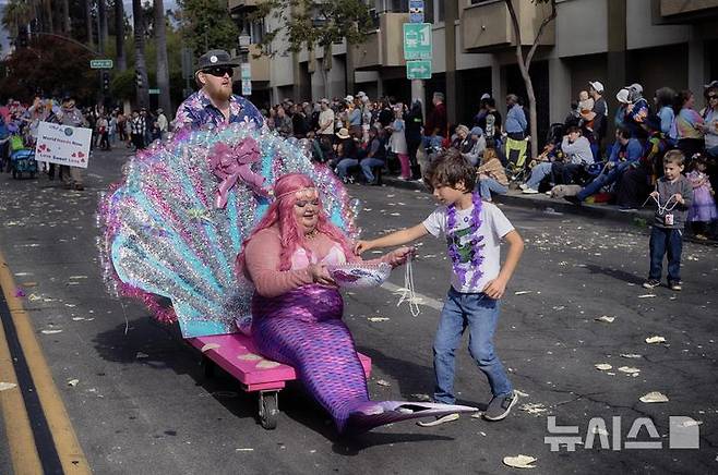[패서디나=AP/뉴시스] 24일(현지시각) 미 캘리포니아주 패서디나에서 연례 패서디나 '두 다 퍼레이드'(Doo Dah Parade)가 열려 인어공주 복장의 참가자들이 어린이들에게 진주목걸이를 나눠주고 있다. 1978년에 시작된 이 행사는 독특한 참가자들이 기발하고 엉뚱한 아이디어로 재미있는 퍼레이드를 펼친다. 2024.11.25.