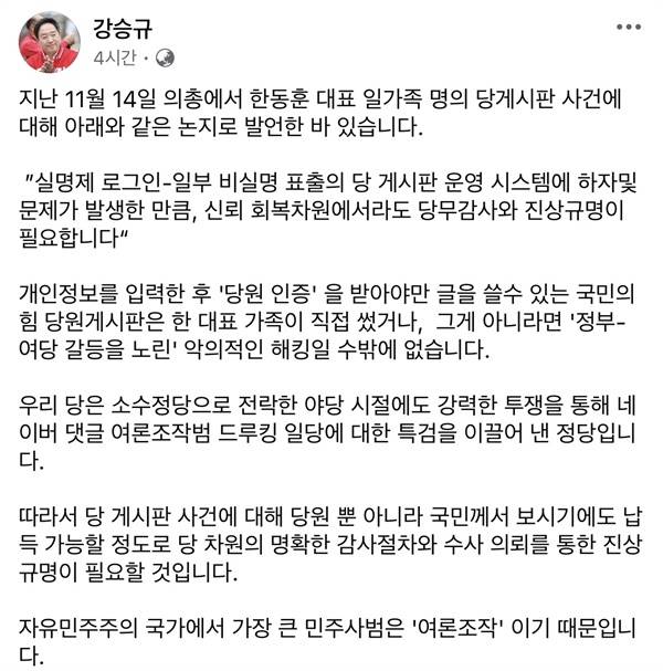 이에 대해 강 의원은 24일 자신의 SNS를 통해 "당 게시판 사건에 대해 당원뿐 아니라 국민이 보기에도 납득 가능해야 한다"면서 "당 차원의 명확한 감사 절차와 수사 의뢰를 통한 진상규명이 필요할 것"이라고 주장했다.