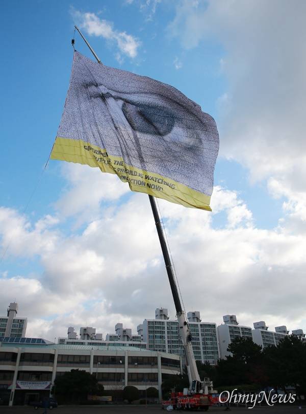 플라스틱협약 5차 정부간협상위원회(INC-5)가 열린 25일 오전. 이곳으로부터 직선거리 1km 정도 떨어진 부산 해운대구 수영만요트경기장에 건물 10층 높이의 크레인이 작동하기 시작했다. 휘날린 상징물은 가운데에 눈 모양이 선명한 가로 30m, 세로 24m 크기의 초대형 깃발이었다.