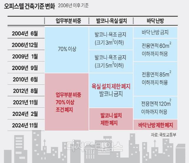 오피스텔은 바닥 난방이 금지돼 있다가 2006년 전용면적 60㎡까지, 2009년엔 85㎡ 이하까지 할 수 있도록 풀렸다. 바닥 난방 금지는 2021년 120㎡ 이하까지 완화됐다가 3년 만에 아예 사라지게 됐다.