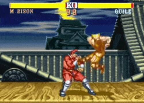 조기자: 구석에 몰린 가일이 류의 장풍 압박을 어떻게 넘어서느냐? 이렇게 넘어섭니다. 타이밍을 맞춘 썸머솔트 킥은 장풍은 피하고 상대방에게 큰 타격을 줄 수 있죠. 이러한 공략은 류와 켄, 그리고 달심에게도 유효합니다.