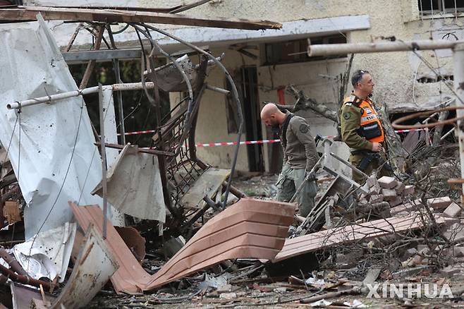 [페타티크바=신화/뉴시스] 24일(현지시각) 이스라엘 중부 페타티크바에서 구조대원들이 레바논에서 발사된 로켓 공격 현장을 수색하고 있다. 이스라엘 당국은 레바논 무장 정파 헤즈볼라가 이스라엘로 약 250발의 로켓포를 발사해 이를 대부분 요격했으나 최소 7명이 다쳤다고 밝혔다. 2024.11.25.