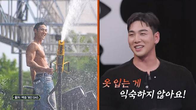 지난 여름 화제가 된 '조각 몸매' 사진들이 언급되자, 백호는 "옷 입은 게 익숙하지 않다"며 스튜디오를 달궜다. 데프콘은 "거의 헐벗고 있더라"며 페스티벌 남신으로 자리매김한 백호의 후끈한 사진들에 감탄했다.