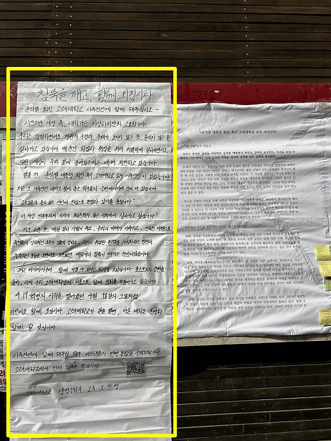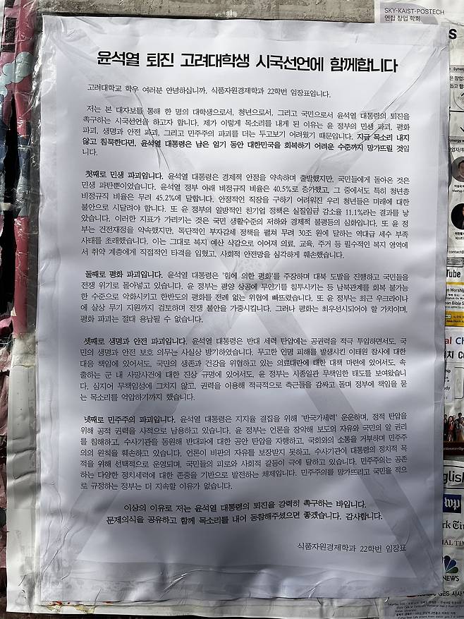[고려대 학생 대자보] "윤석열 퇴진 시국선언, 함께하자"