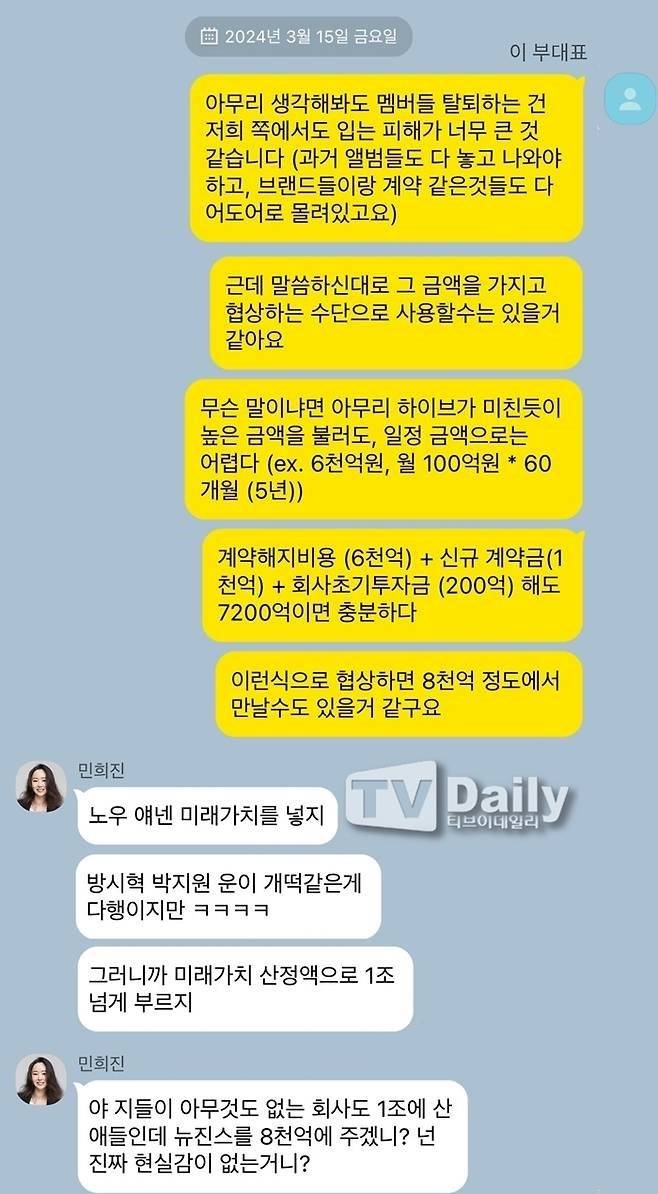 세 사람은 대화록에서 뉴진스 멤버 1인당 월평균 매출액을 20억, 계약해지 기간을 올해 6월로 기준해 물어야 할 멤버 전원의 위약금이 6000억 원을 웃돈다고 분석했다. 뉴진스가 전속계약을 해지할 경우 물어야 할 위약금은 높은 부가가치에 비례했다.