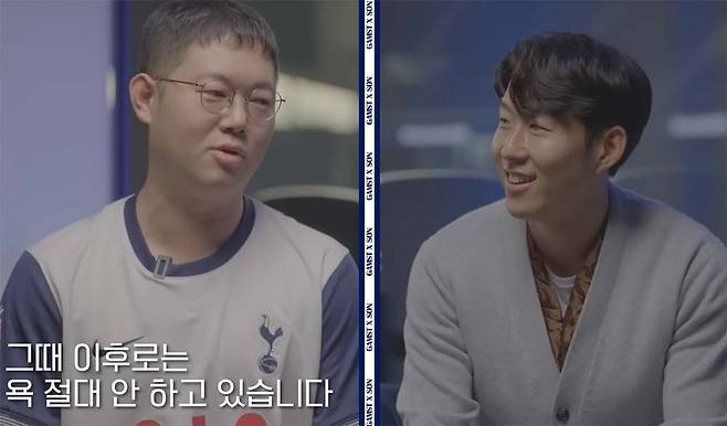 영국 프리미어리그 맨체스터 유나이티드 팬인 감스트는 잠시 고개를 숙인 뒤 "제 영상을 시청하신 적 있으시냐"고 물었다. 손흥민은 "항상 축구 영상을 찾게 되면 좀 자주 나오더라. 리액션 같은 것을 많이 봤던 것 같다"고 답했다. 이에 감스트는 "제가 토트넘 경기도 항상 중계하고 있다. 그래서 손흥민 선수에 대해서도 항상 좋게 좋게 얘기하고 있다"고 설명했다. 이어 그는 "'그때' 이후로는 욕 절대 안하고 있다. 다시 한번 사과드린다"고 전했다. 이에 손흥민은 사과를 받아들이며 "괜찮다"고 격려했다.