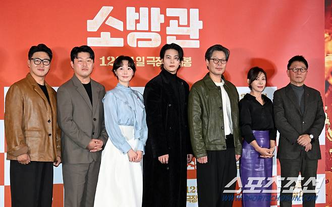 25일 용산 CGV에서 열린 영화 '소방관'의 언론시사회, 왼쪽부터 오대환, 김민재, 이유영, 주원, 유재명, 장영남, 곽경택 감독이 포토타임을 갖고 있다. 용산=허상욱 기자 wook@sportschosun.com/2024.11.25/