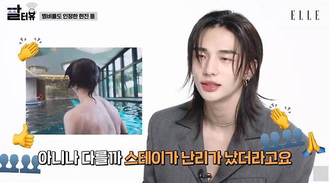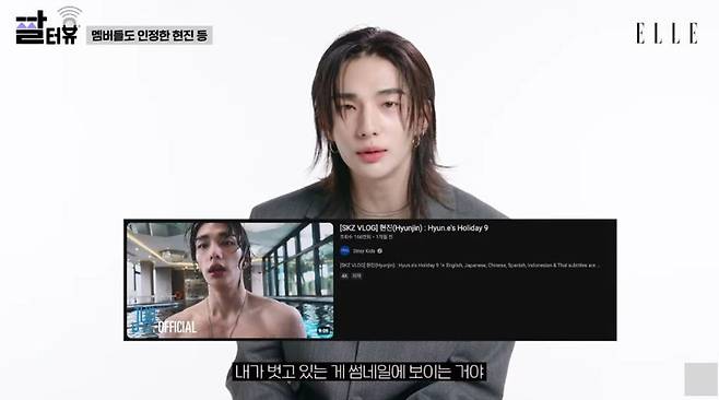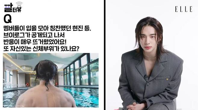 앞서 스트레이키즈 브이로그 공개 후 현진의 '머슬 등짝'에 대한 반응을 뜨겁게 달아오른 가운데 현진은 "등짝 말고 또 자신 있는 신체 부위가 있나?"라는 질문에 "안 그래도 유튜브를 내리다가 뭔가가 뜬 거다. 내가 벗고 있는 썸네일이 있더라. 바로 옆에 스키지기가 있어서 '이거 너무 의도적인 거 아닌가'라고 하니 '봐봐, 어떻게 되는지'라고 했다. 아니나 다를까 팬들이 난리가 났다"라고 답했다.