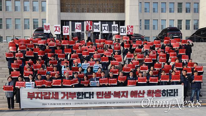 | ▲ 야4당(조국혁신당·진보당·기본소득당·사회민주당)과 민주노총, 한국노총 등 시민사회 단체들이 25일 오후 서울 여의도 국회 본청 계단에서 3차 부자감세 거부, 민생·복지 예산 확충 요구 기자회견을 열어 거대 양당의 책임 있는 자세를 촉구했다. |