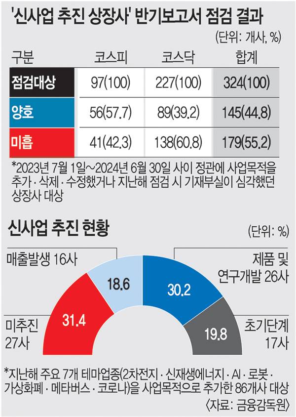 금감원은 최근 1년(지난해 7월 1일~지난 6월 30일)간 정관에 사업목적을 추가·삭제·수정한 상장사 178개사, 지난해 점검 시 기재부실이 삼각했던 146개사 등 324개사를 대상으로 반기보고서를 점검·분석했다. 사업목적 현황과 변경 내용, 추진현황 등 공시 작성 기준을 모두 충족한 회사는 145개사(44.8%)이며, 179개사(55.2%)는 최소 1개 이상 세부 점검항목에서 기재가 미흡한 것으로 나타났다.
