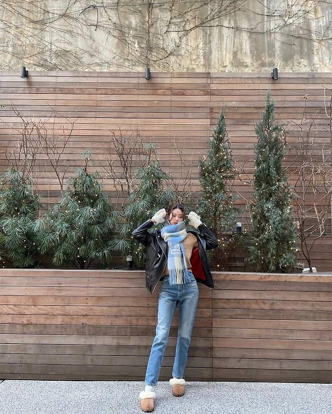 마지막 사진에서도 장원영은 럭셔리함과 여성스러움을 모두 놓치지 않았다. 전체적으로 블랙 가죽 자켓과 핏한 데님을 매치하여 여성스러움을 강조한 룩이지만, '아크네 스튜디오'의 체크 목도리를 착용해 포인트를 주었다. 그는 이너로 베이지색 케이블 니트를 매치하여 가죽 자켓의 빨간색 안감과 대비를 이루며 룩의 분위기를 살렸다. 또한 신발로 어그 슬리퍼를 신어주고 도톰한 흰색 장갑을 착용해 약간의 귀여움을 더해 주었다.