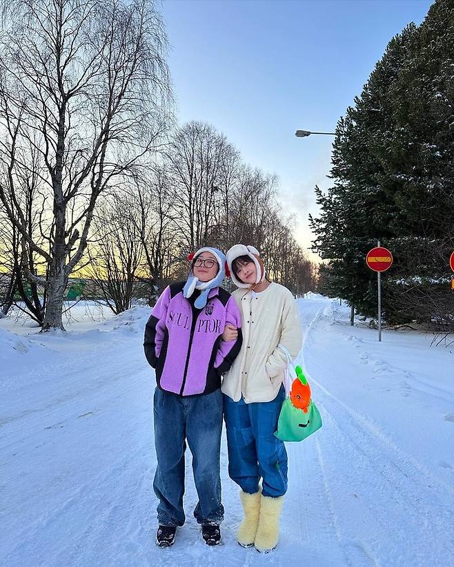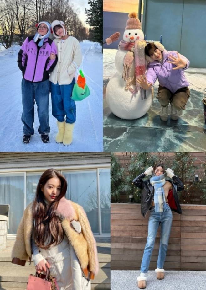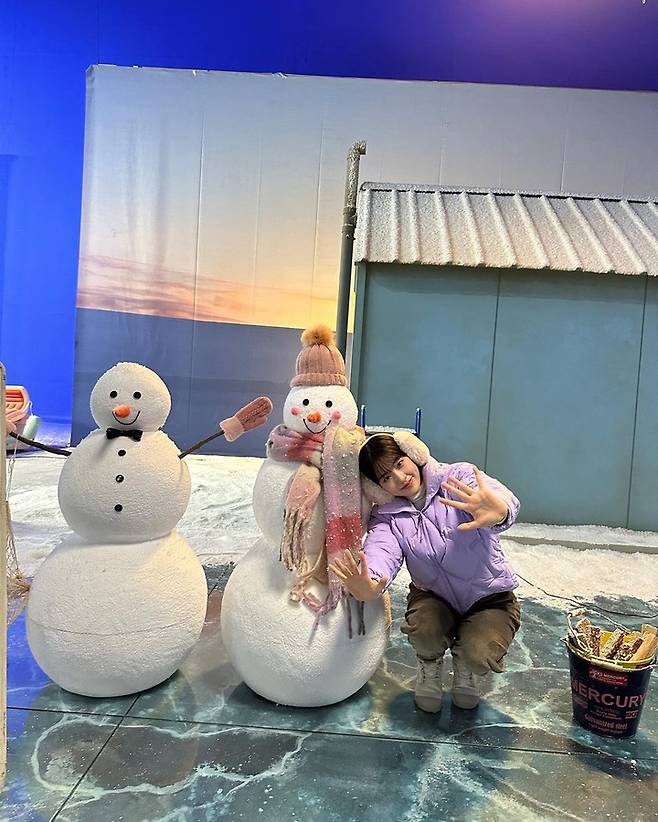 위 사진은 안유진이 눈사람 옆에서 쪼그려 앉아 포즈를 취하고 있는 모습이다. 안유진은 겨울철에 패딩 코디를 자주 선보이는데, 이 사진에서는 라벤더 색상의 패딩에 올리브색 코듀로이 팬츠를 매치해 귀여운 매력을 한껏 끌어올렸다. 또한 얼굴만한 귀마개를 쓰고 활짝 웃는 모습은 전체적인 스타일에 활기를 더해주며 완성도를 높였다.