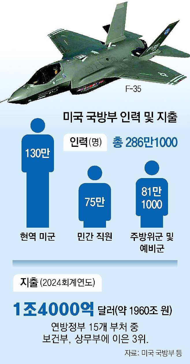미 버지니아주 알링턴에 있는 오각형의 청사 건물을 보유한 국방부는 흔히 ‘펜타곤’(오각형이란 뜻)이라는 별칭으로 불린다. 286만 명의 인원, 2024회계연도(2023년 10월∼2024년 9월) 기준 1조4000억 달러(약 1960조 원)를 지출한 ‘공룡 부처’다. 지출 규모 역시 연방정부 산하 15개 부처 중 보건부, 상무부에 이은 3위다.