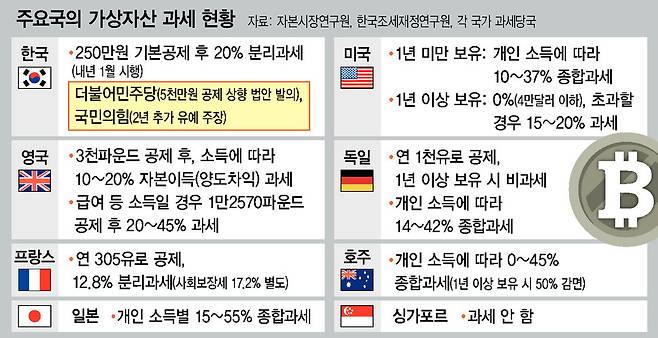 정부·여당이 두차례 연기된 가상자산 과세 시행을 2년 더 유예하자는 주장을 이어가고 있다. 시행 유예론의 주된 이유는 ‘과세 인프라 미비’다. 현재 국외 거래소를 통한 거래는 과세 당국이 파악하기 어렵다는 점을 강조한 것이다. 그러나 미국·일본·독일 등 주요국은 비슷한 한계 속에서도 이미 가상자산에 대한 과세를 하고 있다. 과세 유예론이 실은 증세에 대한 반발 여론을 피하려는 정치적 행보라는 평가가 나오는 까닭이다.