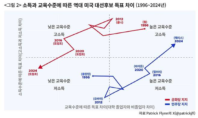 저소득층의 이탈은 더 드라마틱하다. 최근 30년 사이 처음으로 저소득층이 공화당에 더 높은 지지율을 보여줬다. 〈그림 2〉는 민주당과 공화당이 서로 자리를 바꾼 모습을 명확히 보여준다. 1996년만 하더라도 빌 클린턴 대통령은 저소득층과 교육수준이 낮은 유권자에게 지지를 받았고, 밥 돌 후보는 고소득층과 교육수준이 높은 유권자의 지지를 받았다. 28년 후, 트럼프와 해리스는 전혀 다른 위치에 서 있다. 민주당이 대학 교육을 받은 유권자의 지지를 더 받게 된 건 2016년부터라 하더라도, 저소득층의 지지를 빼앗긴 건 이번이 처음이다.