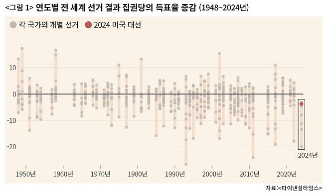 〈그림 1〉은 이번 대선을 하나로 정확히 요약한다. 올해 전 세계 모든 선거에서 집권당은 예외 없이 득표율이 떨어졌다. 1950년 이래로 단 한 번도 없었던 일이다. 2008년 세계 금융위기 때도, 1980년대 인플레이션 위기 때도, 집권당들이 이렇게 참패해본 적은 없다. 올해 미국 선거 결과의 붉은 점을 보면, 그나마 전 세계 집권당 중에서 가장 우수한 성적을 보여준다. 반(反)트럼프 진영이 최대 결집했지만, 전 세계적 인플레에 따른 집권당에 대한 불만을 이기기에는 한계가 있었다.