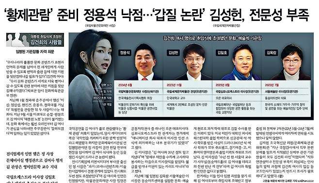 신문은 "전시기획업체 코바나컨텐츠를 운영(2009년 9월~2022년 5월)해 온 김 여사가 문화·예술계에 큰 영향력을 행사하고 있다는 이야기가 알음알음 퍼진 지 오래"라며 "김 여사가 대통령 취임식에 초대한 개인 인맥들이 문화 분야 기관장 자리를 여럿 꿰찬 것을 가볍게 볼 수 없는 이유"라고 썼다.