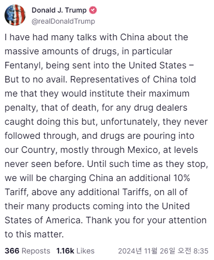 도널드 트럼프 미국 대통령 당선인이 25일(현지시간) 오후 트루스소셜에 중국에 대해 10%포인트 관세율 상승을 예고했다.