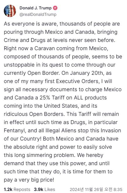 모든 사람들이 알고 있듯이, 수천 명의 사람들이 멕시코와 캐나다를 통해 유입되고 있으며, 이전에 볼 수 없었던 수준의 범죄와 마약을 가져오고 있습니다. 현재 멕시코에서 오는 수천 명으로 구성된 카라반이 우리의 현재 개방된 국경을 통과하려는 노력에서 멈출 수 없는 것처럼 보입니다. 1월 20일, 제가 취임 후 많은 첫 행정명령 중 하나로, 미국으로 들어오는 모든 제품에 대해 멕시코와 캐나다에 25%의 관세를 부과하는 데 필요한 모든 문서에 서명할 것입니다. 이는 터무니없이 개방된 국경에도 적용됩니다. 이 관세는 마약, 특히 펜타닐과 모든 불법 외국인들이 우리나라에 대한 이 침략을 중단할 때까지 유효할 것입니다! 멕시코와 캐나다 모두 이 오랫동안 끓어오른 문제를 쉽게 해결할 절대적인 권리와 힘을 가지고 있습니다. 우리는 이들이 이 힘을 사용할 것을 요구하며, 그렇게 할 때까지 그들이 매우 큰 대가를 치를 때가 왔습니다!