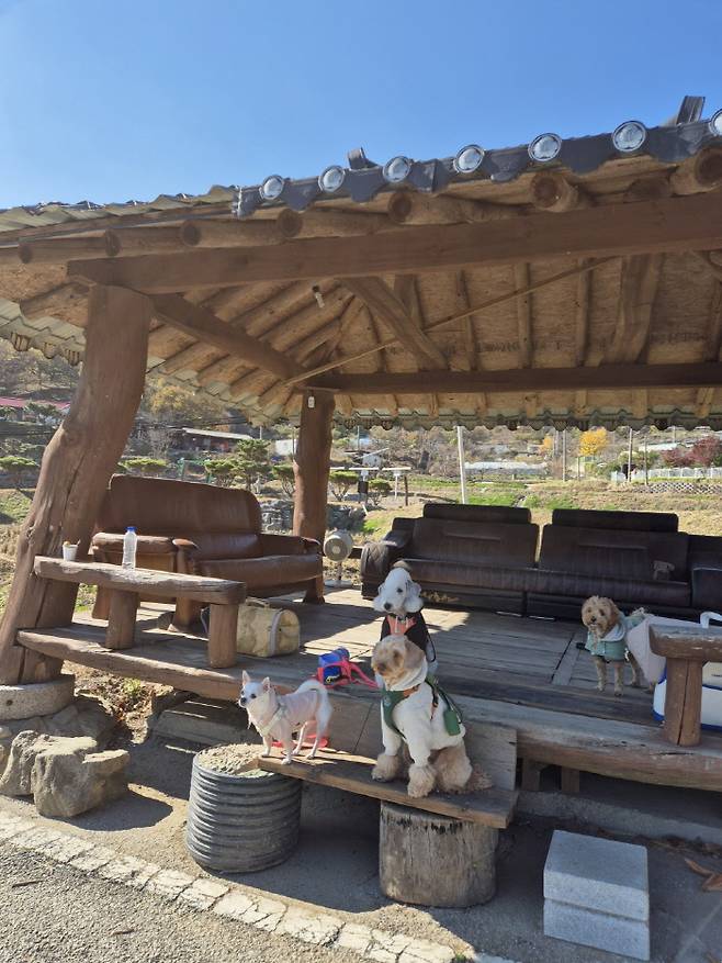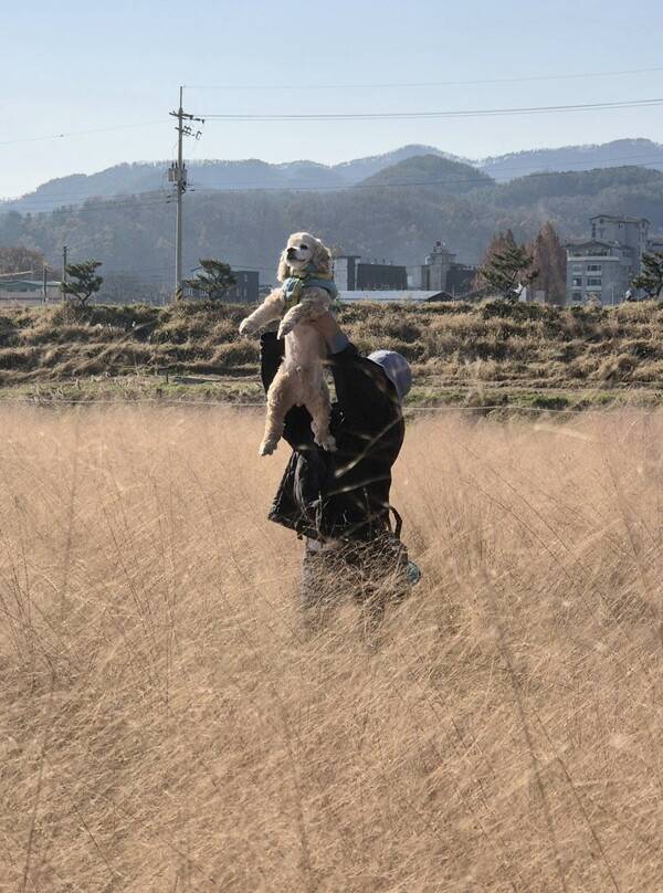 가을 끝자락이라 핑크뮬리는 브라운뮬리가 되었다. 유구읍에 자리한 핑크뮬리 정원에서 마지막 기념사진을 찍었다. 강아지 사진을 찍는 것은 어린 아이 사진 찍기와 같다. "여기 봐! 무무야~ 간식간식! 고구마!!" 무무는 소리를 못 듣는 청각장애견인데도, 다른 보호자들은 카메라 옆에서 손짓을 과도하게 하며, 나와 무무의 인생견생 사진을 위해 최선을 다해주었다. 화장실에 갈 때는 서로의 강아지를 봐주고, 카메라 앞에서도 한 컷의 사진을 위해 도와주는 것은 반려인들의 인지상정이다. 강아지 패키지 여행의 장점 중 하나다.