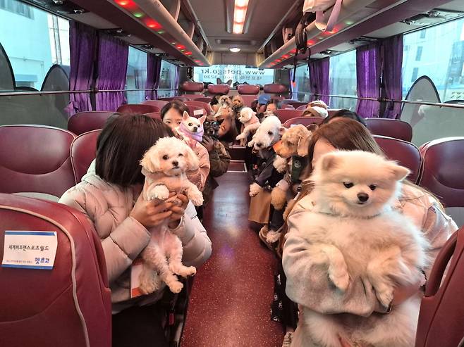 여행사에서 제공한 강아지 안전벨트를 하네스에 묶고 출발했다. 이번 여행의 펫가이더(Pet Guider)인 신종태 펫츠고 부대표가 인원+견원 체크를 시작했다. 보호자가 "네!"하고 대답을 하면, 강아지도 "멍"하고 대답했다. 일정 설명을 마치니 다들 조용해진다. 이번 투어에 참여한 강아지들은 사회생활 경험이 많고 사진찍기에 익숙해서 그런지 모두 말을 잘 알아듣고 얌전했다. 버스가 소란스러웠을까? 전혀 아니었다. 코커스패니얼, 말티푸, 폼피츠, 베를링턴테리어, 푸숑, 몰티즈, 치와와, 믹스견 등 다양한 강아지 친구들의 여행은 생각보다 평화로웠다. 평상시 사납거나 유독 많이 짖는 강아지라면 이런 패키지 투어에 참여하지도 않았을 테니까.