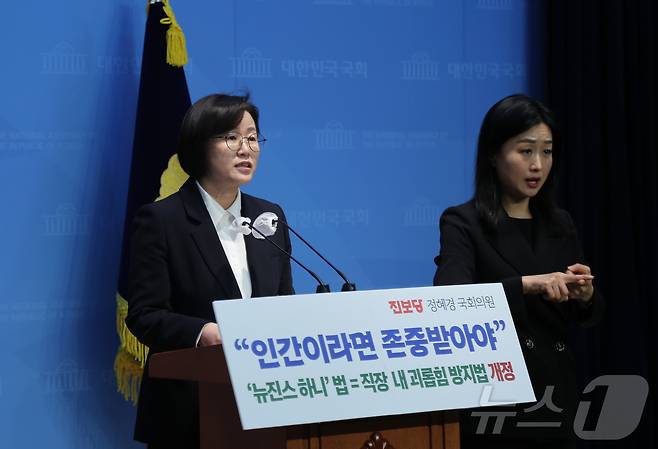 (서울=뉴스1) = 정혜경 진보당 의원이 26일 서울 여의도 국회 소통관에서 직장 내 괴롭힘을 방지할 수 있는 이른바 \'뉴진스 하니법\' 발의 기자회견을 하고 있다. (진보당 제공) 2024.11.26/뉴스1