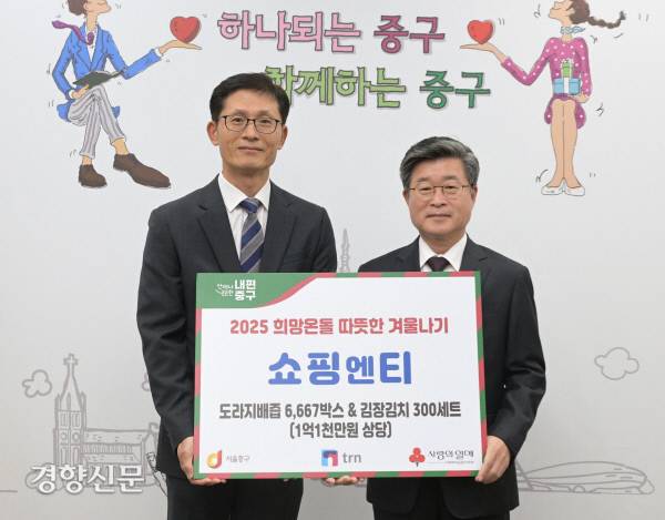 티알엔이 운영하는 T커머스채널 ‘쇼핑엔티’가 지난 25일 서울 중구청에서 ‘희망온돌 따뜻한 겨울나기’ 나눔행사를 열었다. 한상욱 쇼핑엔티 대표이사(왼쪽)이 김길성 중구청장에게 1억 1000만원 상당의 국내산 배즙과 김장김치를 기부하며 기념촬영을 하고 있다. 물품은 관내 저소득층 가정에 전달할 예정이다. 사진=쇼핑엔티 제공