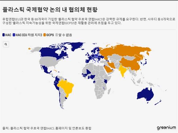 | ▲ 유럽연합(EU)과 한국 등 68개국이 가입한 ‘플라스틱 협약 우호국 연합(HAC)’은 강력한 규제를 요구한다. 반면, 사우디 등 6개국으로 구성된 ‘플라스틱 지속가능성을 위한 국제연합(GCPS)'은 재활용 관리에 초점을 두고 있다. |