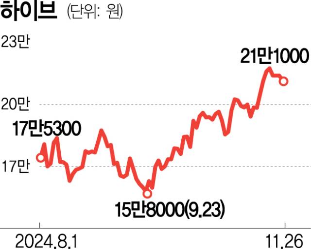 증권가에서는 하이브를 포함한 엔터 업종 주가에 호재가 쌓이고 있다고 분석한다. 당장 하이브는 BTS 컴백을 앞두고 내년 영업이익 추정치가 3475억 원으로 올해 대비 65%가량 늘어날 것으로 보고 있다. 도널드 트럼프 미국 대통령 당선인이 관세 부과를 공언한 후 국내 수출 업종 주가가 지지부진한 탓에 엔터 업종으로 수급이 몰리는 것도 긍정적이다. 앞으로 상황을 지켜봐야겠지만 2016년 이후 계속된 중국의 한한령이 해제될 가능성도 거론되고 있다.