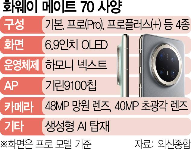 위청둥 화웨이 최고경영자(CEO)는 이날 중국 선전에서 열린 브랜드 기념식에서 “역대 가장 강력한 스마트폰”이라며 메이트70을 소개했다. 그는 “메이트70은 화웨이 최초로 와이파이7을 적용했고 5세대(5G) 속도가 이전 대비 68% 개선됐다”며 자체 개발한 ‘훙멍(하모니) 넥스트’ OS를 사용한다고 밝혔다. 눈길을 끄는 기능은 ‘AI 순간 전송’과 세계 최초로 위성 호출이 가능하다는 점이다. 위성 통신 기능은 전파가 약하거나 기지국이 없어 셀룰러 신호를 사용할 수 없을 때 위성으로 통신하는 기능이다. 특히 화웨이가 미국의 제재를 뚫고 독자 개발하고 중국 파운드리(반도체 위탁 생산) 업체인 SMIC가 제작한 6나노 최신 고성능 칩 ‘기린9100칩’이 장착된 것으로 알려져 주목을 받고 있다. 화웨이의 메이트 70 출시에 대해 로이터통신은 “미국의 제재로 구글 서비스 접근이 차단된 만큼 화웨이가 추진해 온 소프트웨어 독립에 있어 중요한 단계”라고 평기했다.