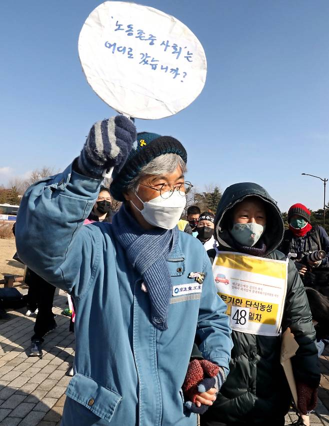 도보행진은 내달 1일 구미 고공농성장 앞에서 끝을 맺는다. 두 선배를 맞을 생각에 설레고 있을 두 노동자가 떠오른다. 해고 노동자를 만나러 가는 선배의 무거운 발걸음과 그보다 더 무거운 마음을 헤아려본다. 백기완 선생도 안 계시고 길 위에는 찬 바람만 분다. 소현숙, 박정혜는 땅에 내려와 새해를 맞을 수 있을까. 1월8일은 그들이 공중으로 떠난 지 1년이 되는 날이다.