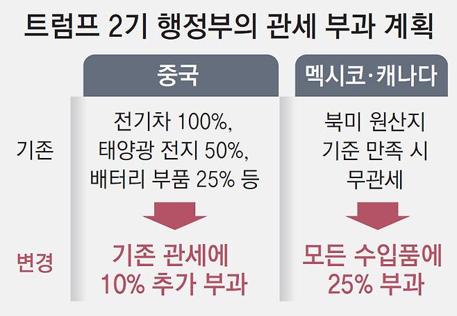 특히 그는 집권 1기 때보다 한층 강화된 관세 폭탄을 예고했다. 첫 임기를 시작한 2017년에도 멕시코, 중국 등을 상대로 관세 부과를 위협했지만 취임 7개월 후에야 중국의 불공정 무역관행을 조사하기 시작했다. 또 2018년부터 중국산 철강 등 일부 품목부터 순차적으로 관세를 매겼다. 하지만 2기에선 무역 관행에 대한 조사나 협상 등을 건너뛰고 취임 첫날부터 모든 수입품에 관세를 부과할 뜻을 밝힌 것이다.