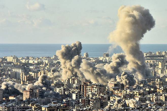 [26일(현지시간) 레바논 수도 베이루트의 남쪽 교외 지역이 이스라엘군 공습을 받았다. (AFP=연합뉴스)]